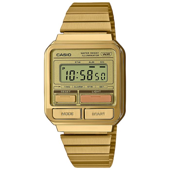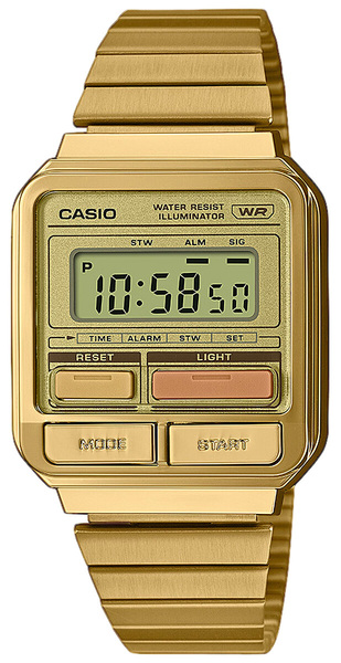 Złota tarcza zegarka Casio A120WEG-9AEF prezentuje się niezwykle efektownie, przyciągając wzrok swoim połyskiem. Czas jest wskazywany na cyfrowym wyświetlaczu, co zapewnia łatwy odczyt, a w ciemności można skorzystać z podświetlenia LED. Casio A120WEG-9AEF oferuje przydatne funkcje, takie jak alarm dzienny, który może służyć jako budzik lub przypomnienie, oraz rozbudowany kalendarz, który umożliwia przeglądanie daty na wiele lat do przodu. Dodatkowo, stoper pozwala na odmierzanie czasu nawet do 1 godziny.