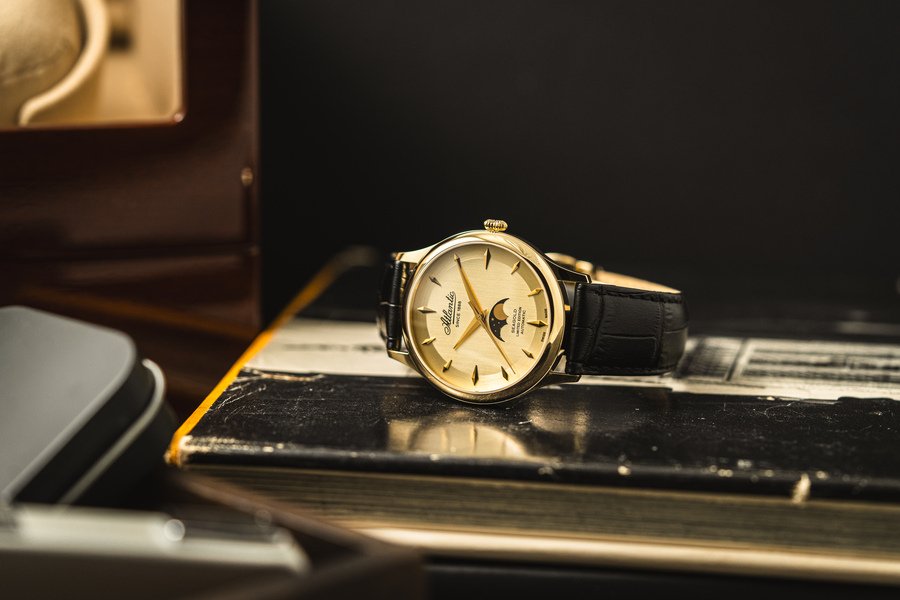Model Atlantic Seagold Moonphase jest wyposażony w pasek z prawdziwej skóry cielęcej o fakturze skóry aligatora, zapinanym solidnym zapięciem motylkowym, dodając elegancji i wygody noszenia.