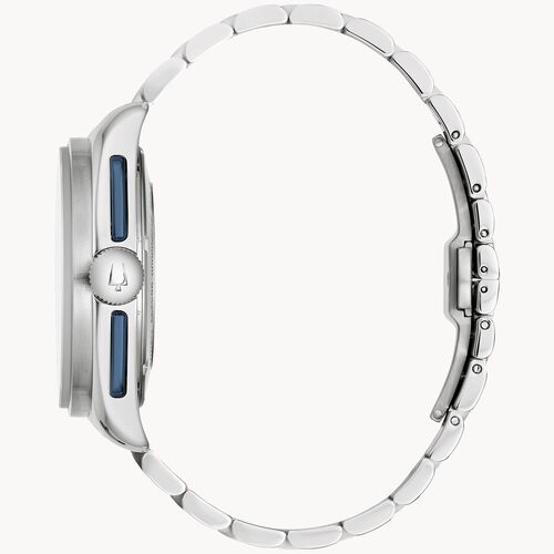 Subtelne, niebieskie przyciski chronografu świetnie współgrają z koronką przyozdobiona logo marki Bulova, która umieszczona jest na godzinie 3.