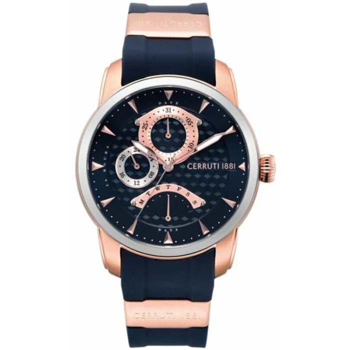 Cerruti CRA21607 to wyjątkowy zegarek męski pochodzący z kolekcji Tesero, który charakteryzuje się dynamicznym stylem. Klasyczna stalowa koperta pokryta odporną na ścieranie powłoką ION w kolorze miedzi została połączona z granatowym paskiem wykonanym z tworzywa sztucznego. Do zabezpieczenia dokładnego kwarcowego mechanizmu i tarczy użyto odpornego na stłuczenia szkła mineralnego. Bezpośrednio pod nim znaleźć można wskazanie czasu w ujęciu 24-godzinnym oraz rozbudowany datownik wskazujący dzień tygodnia i miesiąca. Komponujące się indeksy współgrają z niebieską tarczą, a przy tym pozostają wyraźne i czytelne. Wodoszczelność tego modelu określono jako 100 metrów, co oznacza, że możemy nie zdejmować go z ręki podczas pływania i nurkowania bez specjalistycznego sprzętu.