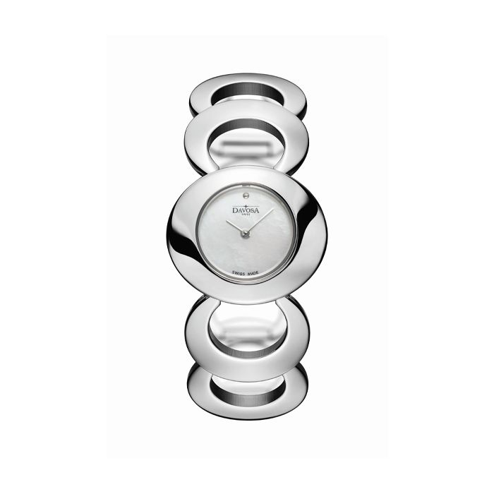 DAVOSA 168.570.55 Vintage 60's, to oryginalny oldschoolowy design zegarka przeznaczony dla kobiet, które cenią ponadczasowy styl i elegancję. Srebrna, okrągła koperta koperta o średnicy 26 mm "wtopiona" została w bransoletkę o tym samym kolorze. Pokrycie zostało wykonane w technologii PVD, która gwarantuje wysoką odporność na ścieranie oraz korozję. W tym modelu zastosowano szafirowe szkło, które jest odporne na zarysowania. Dzięki tej właściwości zegarek zachowa znakomitą kondycję przez cały okres użytkowania. Delikatna biała tarcza z masy perłowej została wykończona wskazówkami w kolorze korespondującym do całości bransoletki. Wodoszczelność 30M pozwala na ograniczony konta z wodą, na przykład zachlapanie.