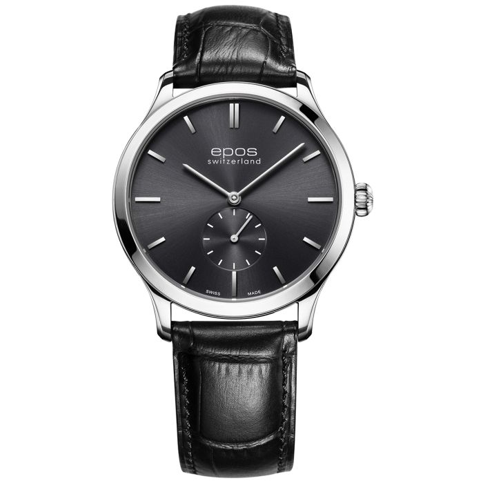 Tarcza tego eleganckiego zegarka Epos z kolekcji Originale jest w odcieniu czerni. Wspaniale odbija światło za sprawą szlifu słonecznego. Kontrastują z nią subtelne srebrne wskazówki oraz indeksy w tym samym kolorze. Zegarek ten posiada oryginalny odczyt czasu — sekundy odczytasz za pomocą subtarczy sekundnika umieszczonej na godzinie 6. Umieszczone nad tarczą szafirowe szkło nie tylko zapewnia ochronę przed różnego rodzaju pyłkami, ale także cechuje się wysoką odpornością na zarysowania.