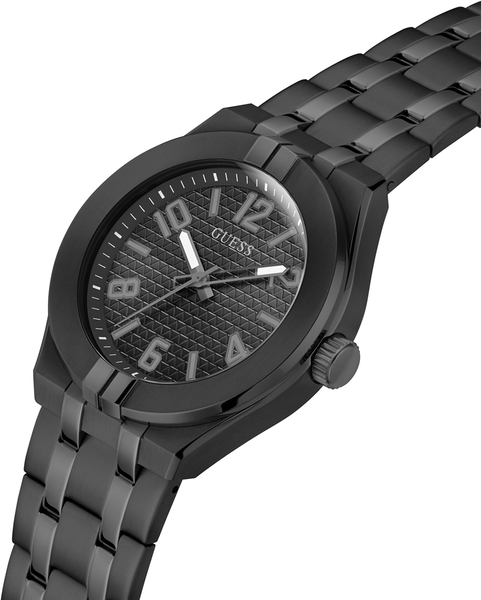 Na czarnej tarczy zegarka GUESS GW0661G3 znajdują się wyraźne cyfry arabskie oraz indeksy godzinowe, co ułatwia odczytanie czasu nawet w słabych warunkach oświetleniowych. Dodatkowe wskazówki dla godziny, minuty i sekundy zapewniają precyzyjny pomiar czasu. Szkło mineralne chroni tarczę przed zarysowaniami, co sprawia, że zegarek zachowuje doskonałą przejrzystość przez długi czas.