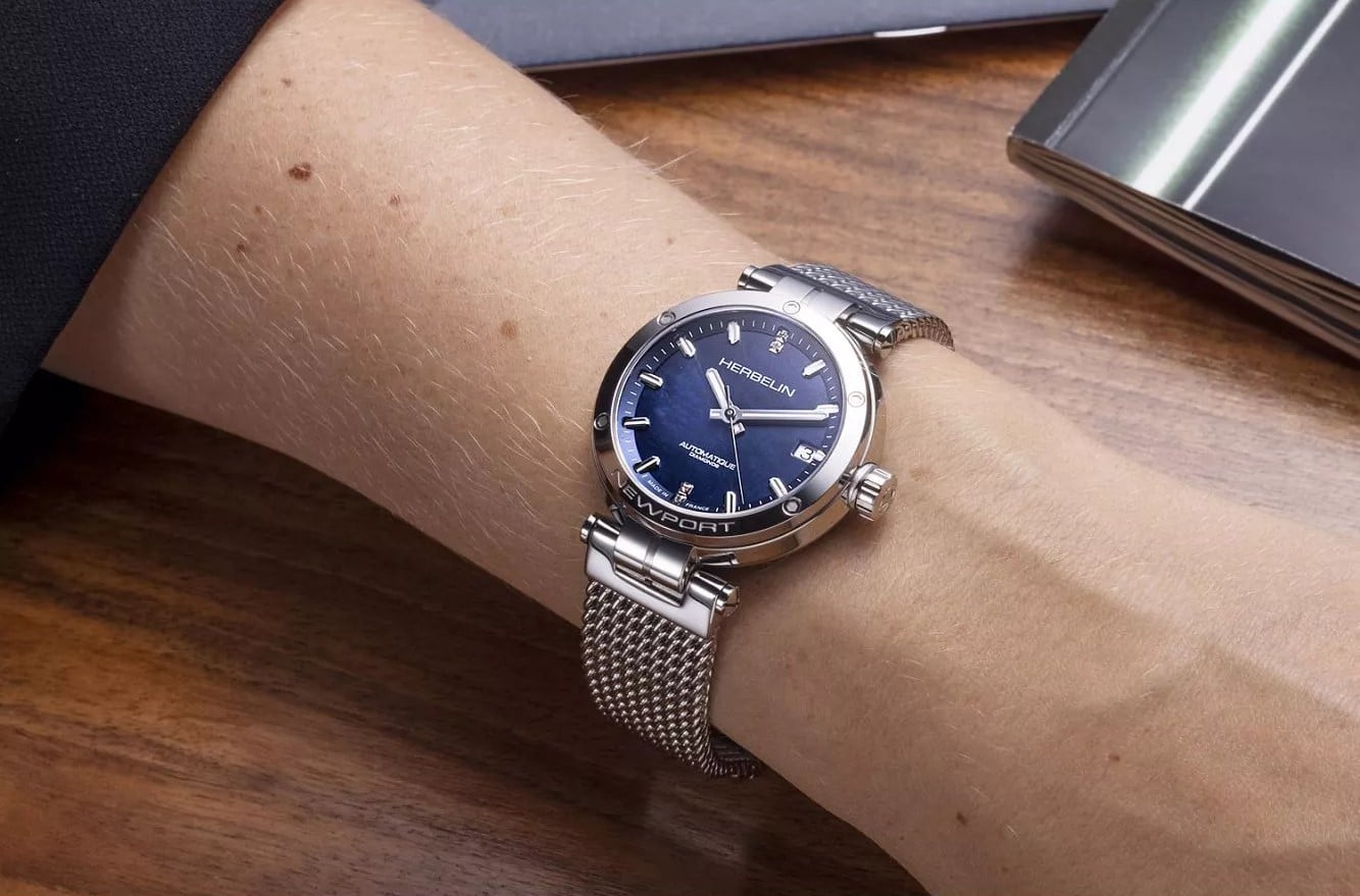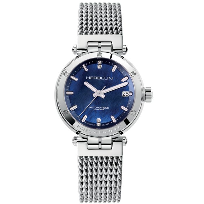 Zegarek damski z niebieską tarczą Herbelin posiada srebrną kopertę umieszczoną na solidnej bransolecie w tym samym kolorze. Obydwa elementy zostały wykonane ze stali szlachetnej 316 L. Ten rodzaj materiału charakteryzuje się odpornością na uszkodzenia mechaniczne oraz działanie korozji. Koperta ma przeszklony dekiel, pozwalający na podglądanie precyzyjnej pracy mechanizmu.