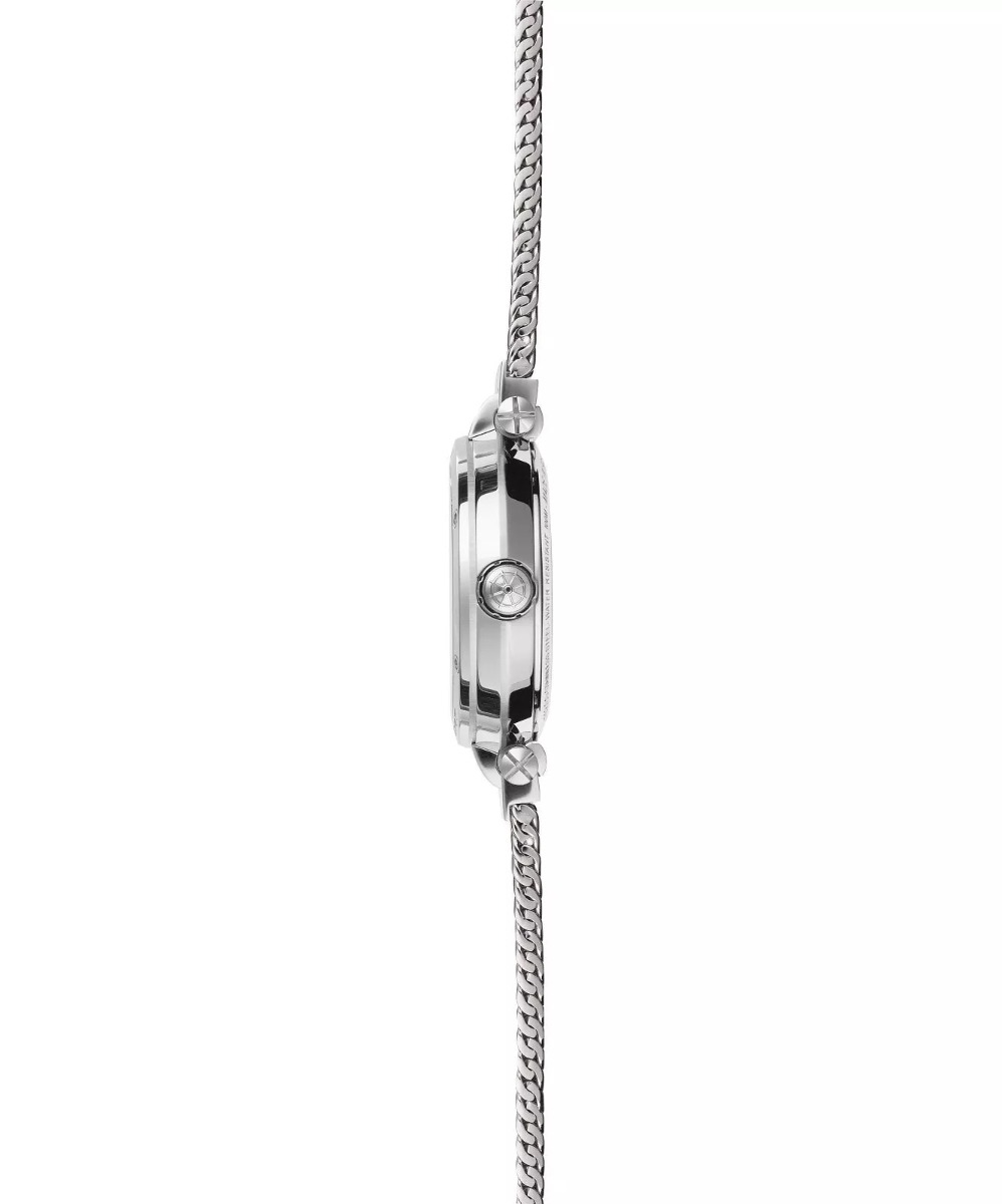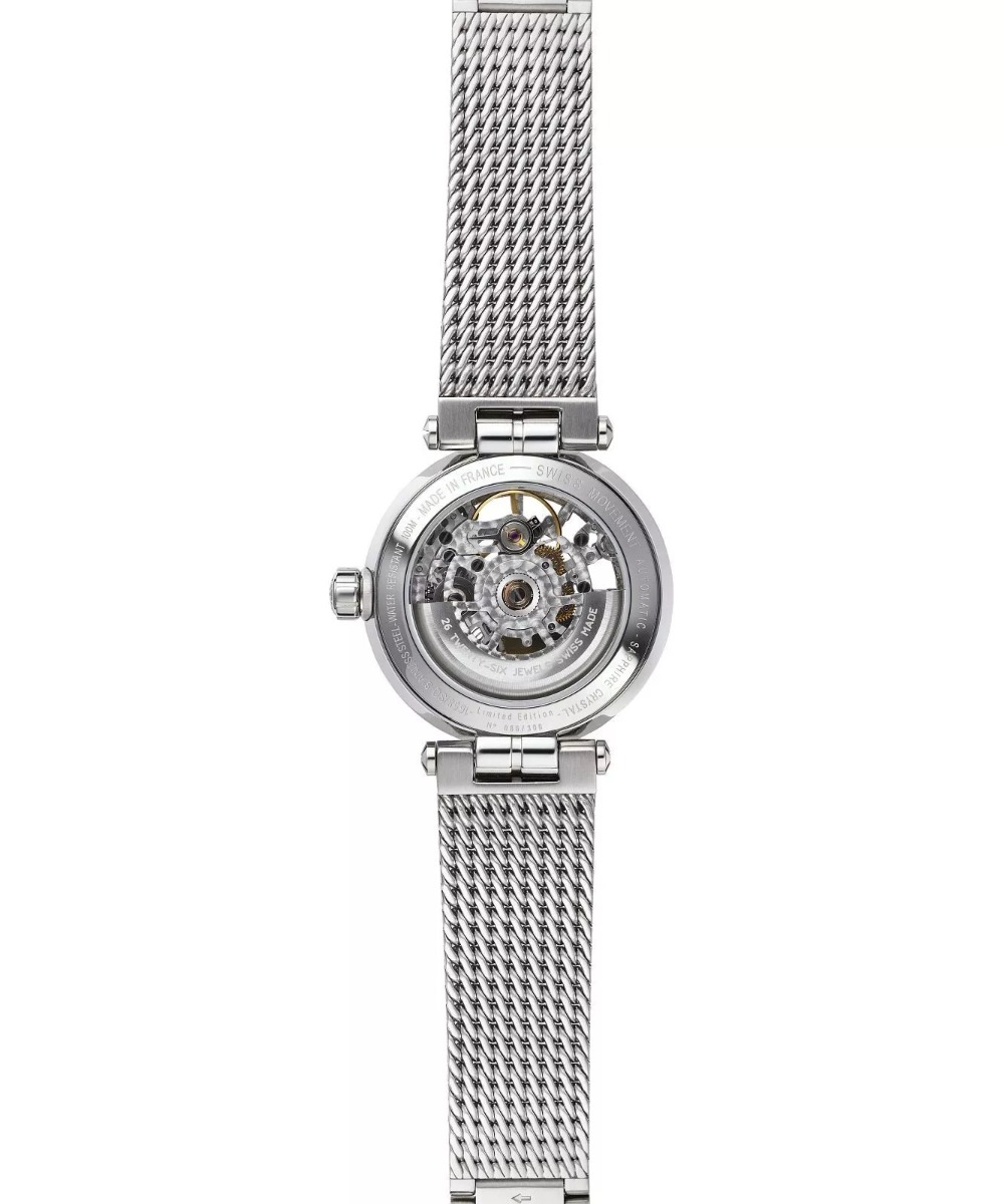 We wnętrzu tego zegarka damskiego na srebrnej bransolecie znajduje się mechanizm automatyczny ETA 2824-2. O jego klasie świadczy wysoka liczba kamieni łożyskujących, która dla tego modelu wynosi 25 sztuk. Szacowany czas rezerwy chodu to 38 godzin.