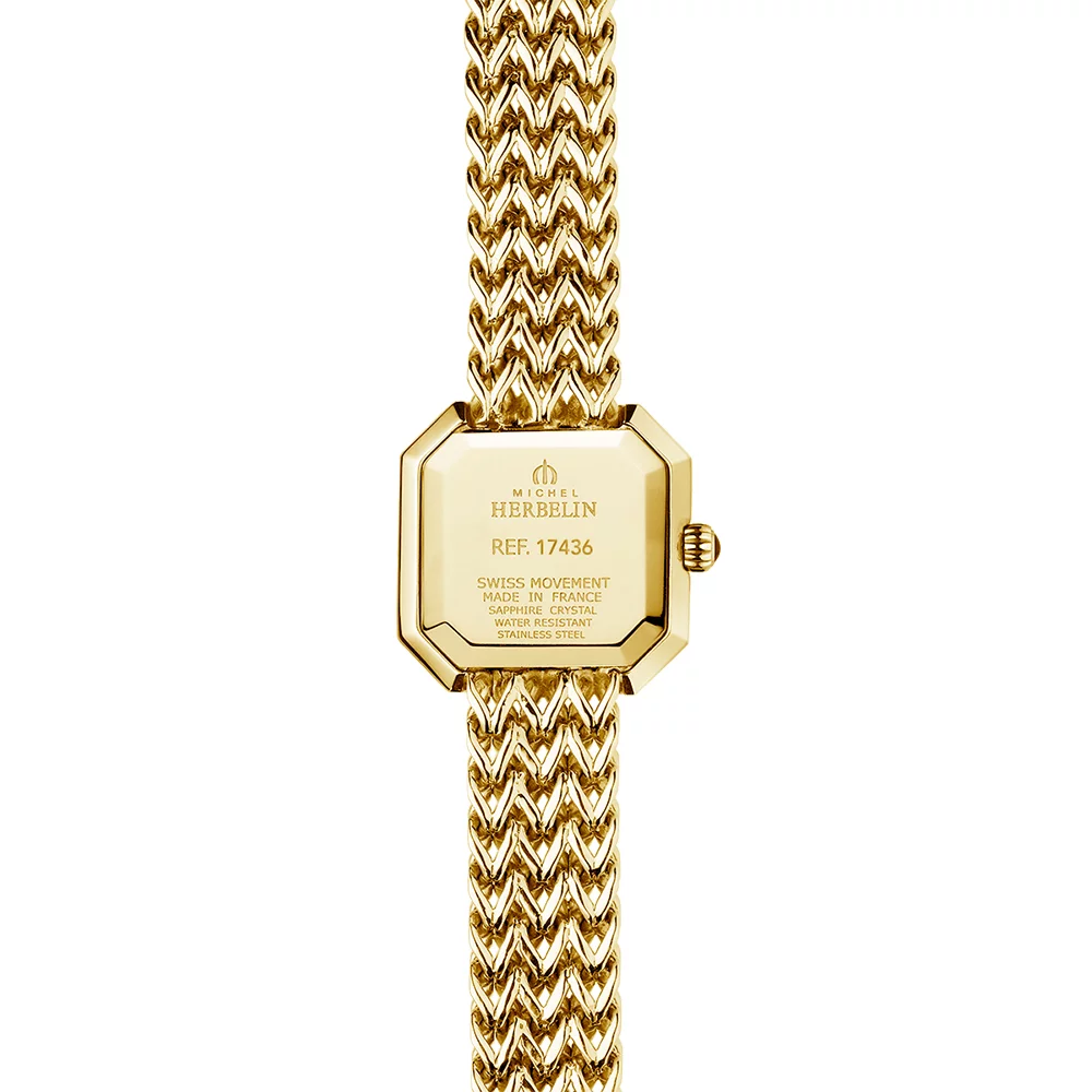 Zegarek damski na złotej bransolecie Herbelin posiada mechanizm kwarcowy Ronda 751. Dzięki jego wykorzystaniu nie musisz codziennie nosić czasomierza, aby zachował ciągłość działania. Zegarki wyposażone w mechanizm kwarcowy charakteryzują się także większą precyzyjnością.