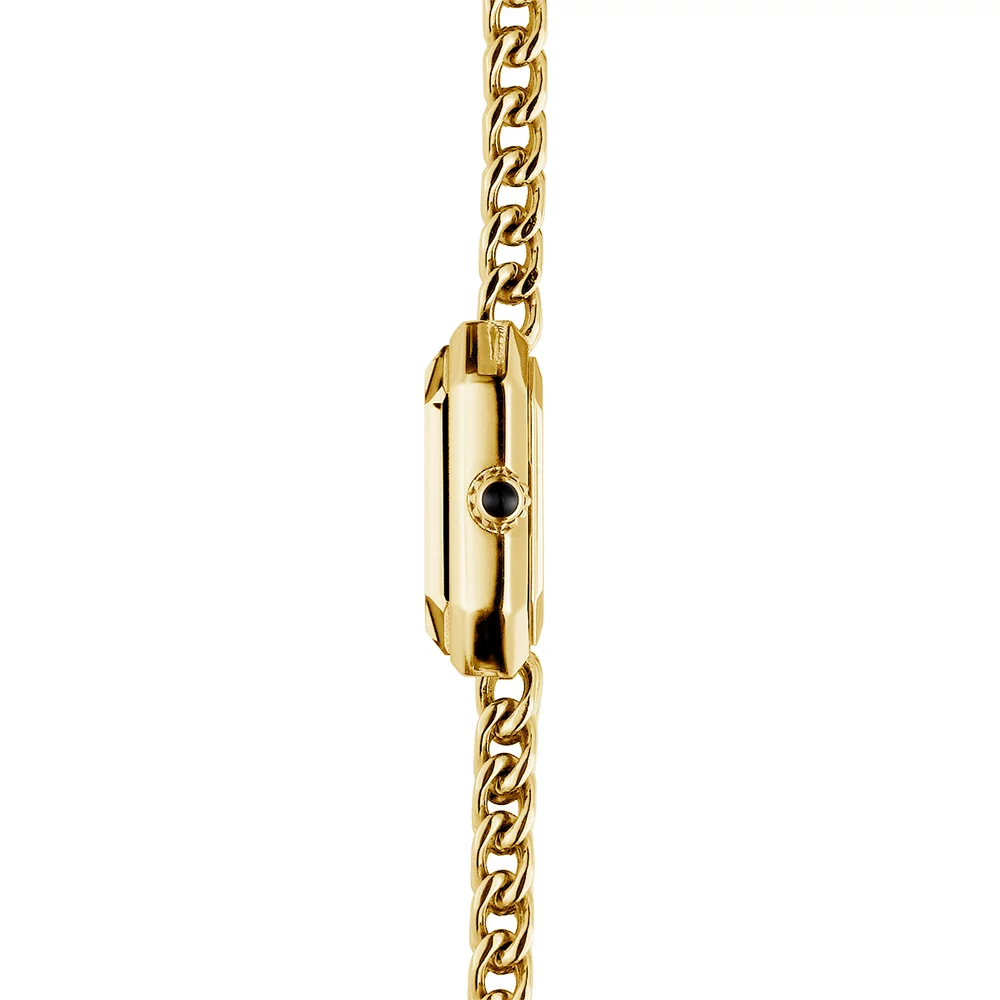 Koperta oraz bransoleta tego damskiego zegarka z czarną tarczą zostały wykonane ze stali szlachetnej 316 L. Ten rodzaj materiału charakteryzuje się dużą odpornością na uszkodzenia mechaniczne oraz działanie korozji. Dodatkowym atutem stali jest jej hipoalergiczność, dzięki czemu jest bezpieczna dla osób o wrażliwej skórze. Zarówno koperta, jak i bransoleta czasomierza mają złoty kolor.