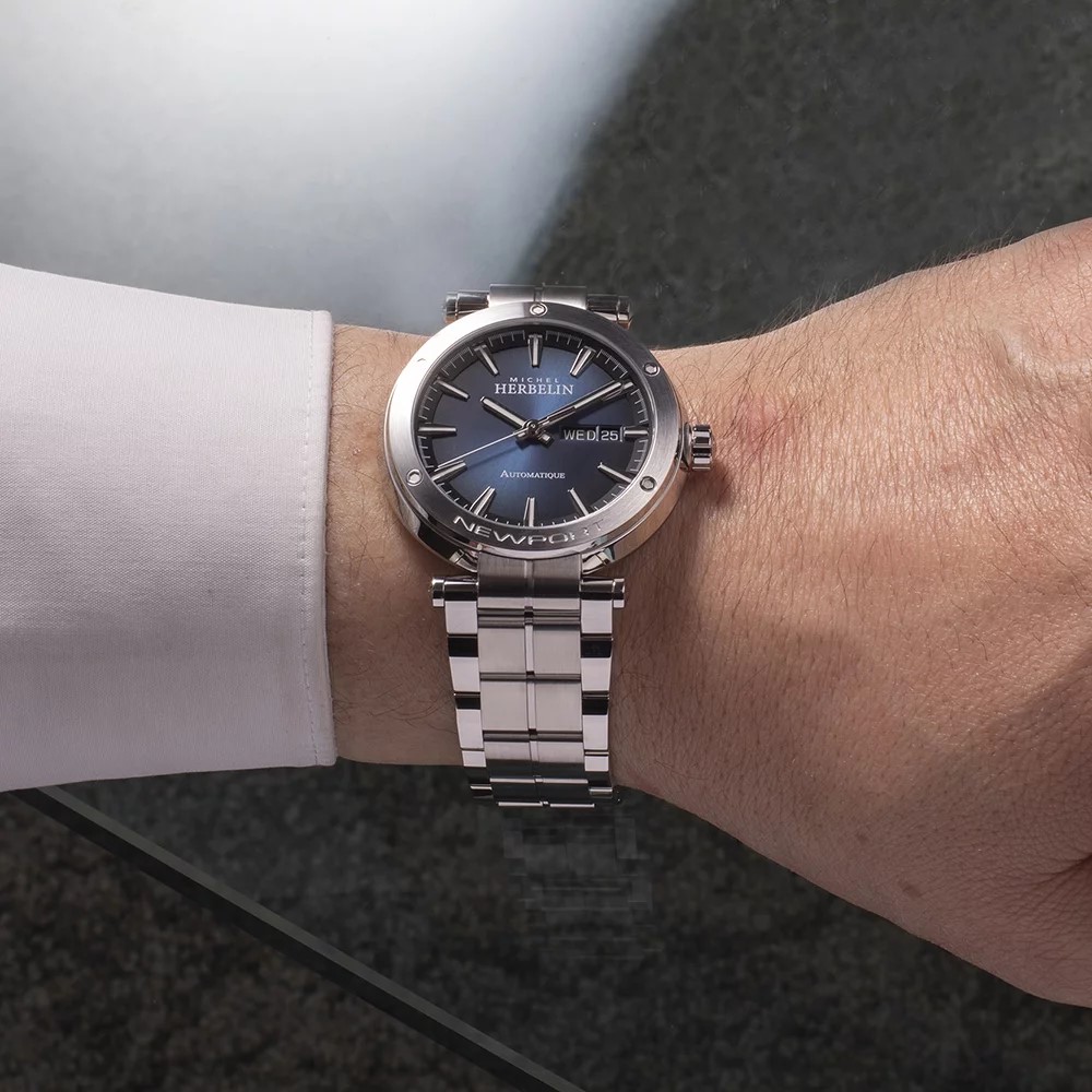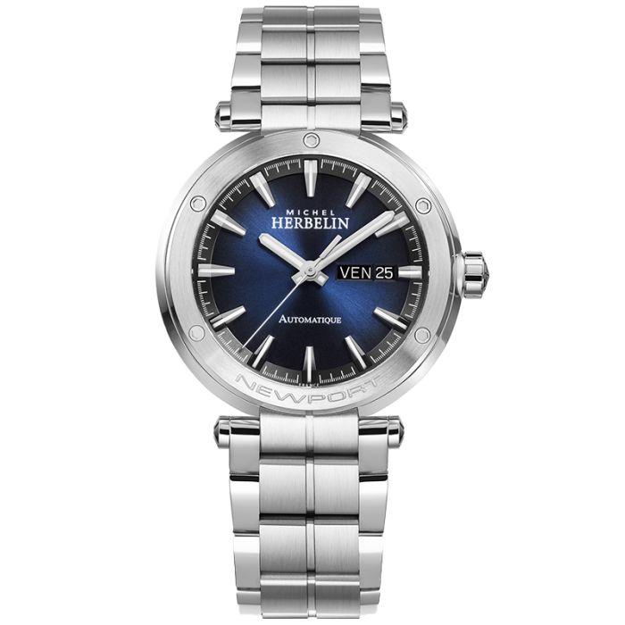 Lśniąca tarcza tego automatycznego zegarka męskiego Herbelin Newport ma niebieski kolor, wykończona jest szlifem słonecznym. Na jej tle wyróżniają się wyraźne, srebrne indeksy oraz stylizowane wskazówki w tym samym kolorze. Zarówno wskazówki, jak i indeksy pokryte są powłoką luminescencyjną, by ułatwić Ci odczyt godziny w ciemności. Na godzinie trzeciej umieszczono datownik wskazujący na aktualny dzień tygodnia oraz miesiąca. Do ochrony tarczy wykorzystano szafirowe szkło, które uznawane jest za jeden z najtwardszych materiałów. Cechuje się ono wysoką odpornością na zarysowania.