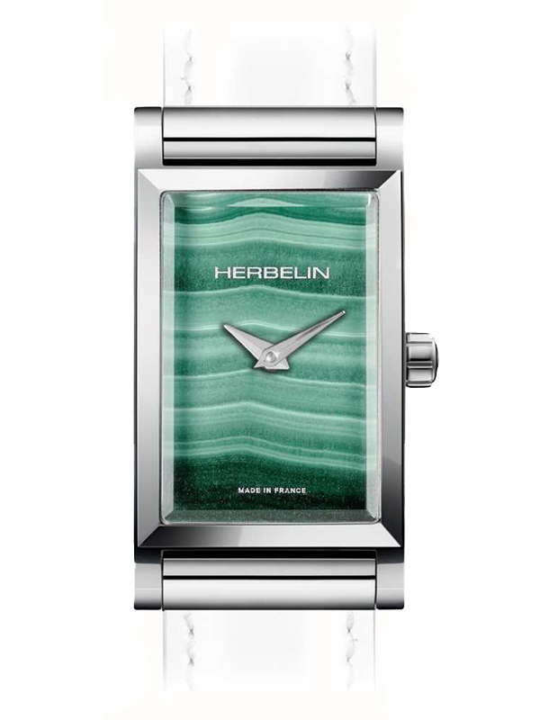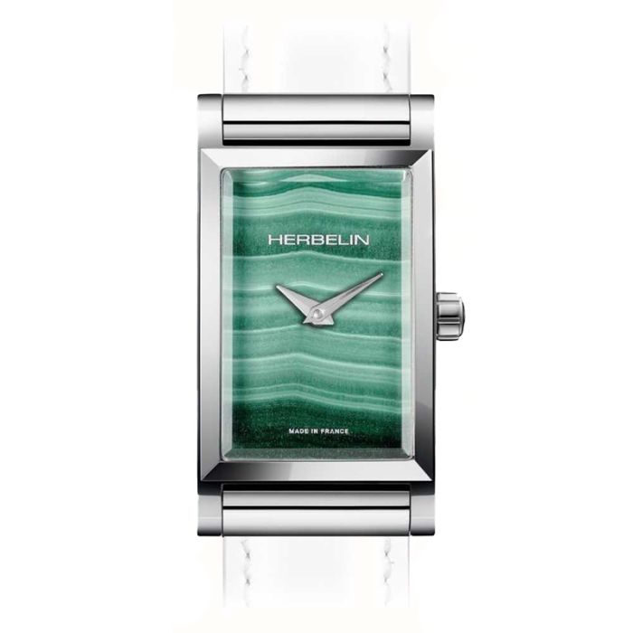Zegarek damski z zieloną tarczą Herbelin posiada srebrną kopertę, wykonaną ze stali szlachetnej 316 L. Wykorzystanie tego rodzaju materiału zapewnia idealną ochronę mechanizmu, gdyż cechuje go niezwykła odporność na warunki zewnętrzne. Koperta została umocowana na białym skórzanym pasku. Skóra naturalna jest nie tylko wytrzymała i odporna na pęknięcia. Dopasowuje się także do kształtu nadgarstka, co zwiększa komfort noszenia.