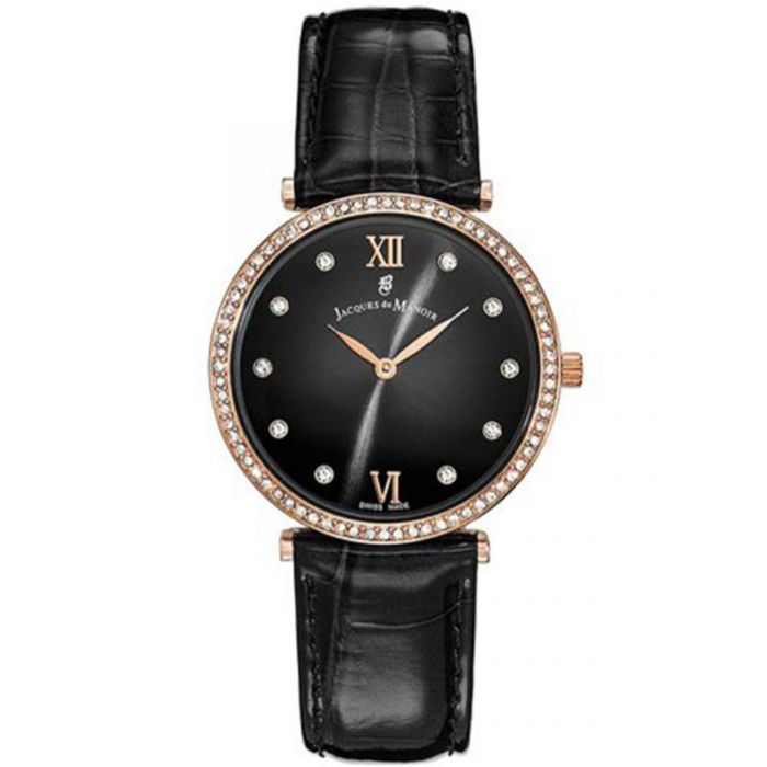 Jacques du Manoir SOR.05 to zegarek zaprojektowany z myślą o kobietach i dla kobiet, które szukają piękna połączonego z precyzją i bardzo wysoką jakością wykonania. Piękna, które doskonale podkreśli codzienny strój stosowany w pracy w biurze i po pracy na mniej formalnych spotkaniach np. ze znajomymi w kawiarni, czy na spacerze. Piękna, które dodaje nam pewności siebie i sprawia, że czujemy się ważne i docenione. Okrągła koperta wykonana z wysokiej jakości stali szlachetniej połączona z eleganckim paskiem ze skóry naturalnej tworzą klasyczne połączenie. Kamienie szlachetne, które ozdabiają bezel i tarczę przykrytą wytrzymałym szkłem mineralnym sprawiają, że kompozycja jest unikatowa i wyjątkowa. Wyraźne indeksy i wskazówki umożliwiają bezproblemowy odczyt czasu, dzięki czemu model nie tylko genialnie prezentuje się na nadgarstku, ale jest praktyczny. Subtelne logo producenta oraz dyskretny napis Swiss Made zamieszczony na godzinie 6 wskazują, że czasomierz jest zaprojektowany i produkowany w Szwajcarii, co jest gwarancją najwyższej jakości i daje pewność, że będzie nam służył przez długie lata. Zegarek wyposażono w precyzyjny mechanizm kwarcowy zasilany baterią, dzięki czemu nie wymaga on nakręcania i jest zawsze gotowy do założenia. Wodoszczelność na poziomie 30 M chroni zegarek przed drobnymi zachlapaniami.