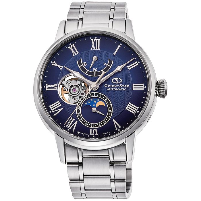 Zegarek z fazami księżyca Orient Star ma przeszklony dekiel, dzięki czemu możesz podziwiać pracę tego precyzyjnego automatyczne gomechanizmu. Jego koperta o grubości 14 mm została wykonana ze stali szlachetnej 316 L, wyróżniającej się dużą odpornością na działanie korozji i różnego rodzaju uszkodzenia mechaniczne. Podobnie jak bransoleta tego czasomierza, ma srebrną barwę.
