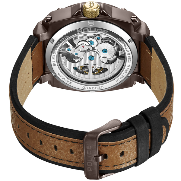 Koperta o niestandardowym kształcie, wykonana z metalu o brązowym kolorze, nadaje zegarkowi unikatowego wyglądu. Szerokość koperty wynosząca 45 mm oraz wysokość z uszami 51.0 mm gwarantują imponującą obecność na nadgarstku. Brązowy pasek z wysokiej jakości skóry naturalnej komponuje się doskonale z resztą zegarka, dodając mu elegancji i stylu.