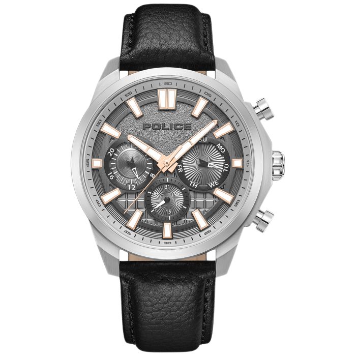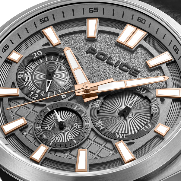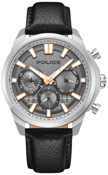 Szara tarcza tego modelu POLICE, ozdobiona szachownicą i ikonicznym logo marki, przyciąga wzrok i podkreśla niekonwencjonalny charakter zegarka. Analogowy odczyt czasu, wzbogacony o wielofunkcyjność mechanizmu, zapewnia intuicyjną obsługę i dostęp do potrzebnych informacji. Szkło ochronne gwarantuje trwałość i odporność na codzienne wyzwania.
