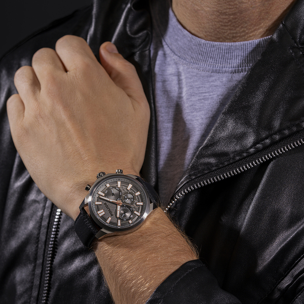 Solidna, stalowa koperta o szerokości 44 mm, szczotkowana i polerowana, to gwarancja wytrzymałości. Czarny pasek ze skóry, który doskonale komponuje się z kopertą, zapewnia komfort noszenia i dodaje zegarkowi elegancji. Zapięcie na sprzączkę gwarantuje łatwość użytkowania i bezpieczeństwo na nadgarstku.
