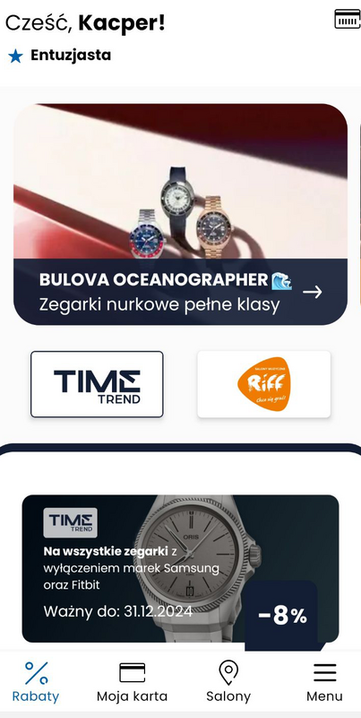 Nasza aplikacja Time to Riff od razu dajcie Ci prezent powitalny w postaci kuponu -8% na wszystkie zegarki (oprócz smartwatchy FitBit oraz Samsung), oraz dostęp do szerokiej gamy kuponów rabatowych na nasz asortyment. Ponadto, gdy polecisz aplikację swoim znajomym możesz otrzymać aż 3 kupony o wartości 50 zł!