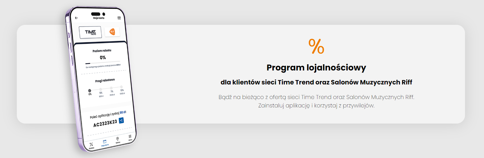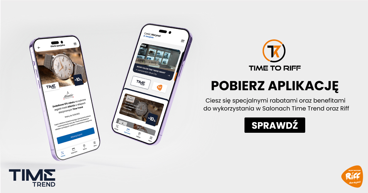 Mamy dla Ciebie niespodziankę! Chcesz wiedzieć co nowego słychać w zegarkowym świecie oraz mieć dostęp do wyjątkowych promocji? Z myślą o Tobie przygotowaliśmy naszą nową aplikację Time to Riff! Aplikacja da Ci dostęp do kodów rabatowych Time Trend dostępnych wyłącznie dla użytkowników.