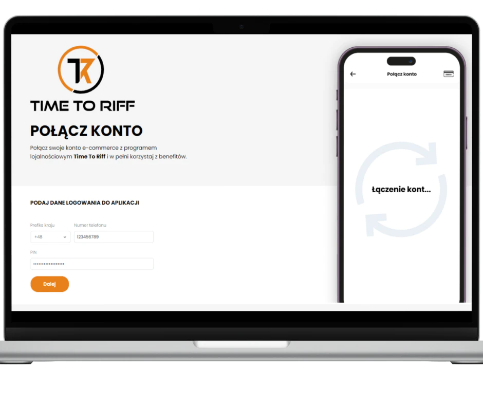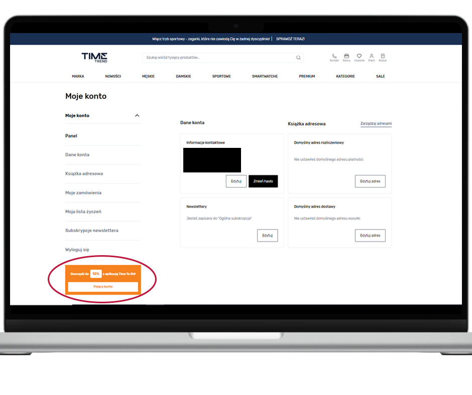 3. Połącz swoje konta. Wystarczy skorzystać z przycisku - “połącz konto” znajdującego się w widoku moje konto w sklepie internetowym timetrend.pl z aplikacją Time to Riff.