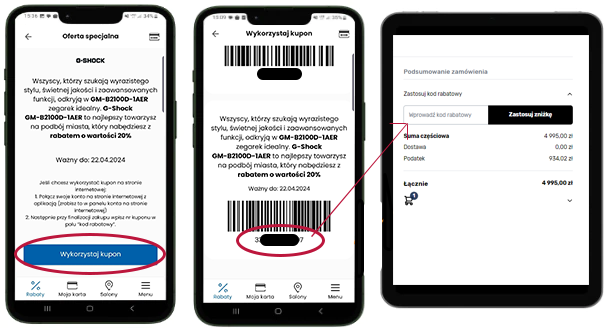 Poziom rabatu będzie wzrastał z poziomem Twoich zakupów. Z ofert specjalnych oraz rabatu będziesz mógł skorzystać zarówno w salonach sieci Time Trend, jak i w sklepie internetowym timetrend.pl. Ponadto w aplikacji cyklicznie będą dodawane promocje specjalne - z pewnością znajdziesz coś dla siebie! Kupony rabatowe Time Trend mają różny czas ważności, każdy kupon można wykorzystać raz.