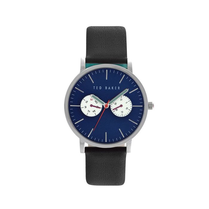 Zegarek Ted Baker Brit 10024785 znakomicie uzupełni strój w stylu smart casual, który sprawdzi się zarówno w biurze jak i poza nim. Koperta o średnicy 40 mm została wykonana z wysokiej jakości stali szlachetnej, która nie ulega korozji. Kopertę zestawiono z gładkim paskiem z naturalnej skóry w kolorze czarnym. Na granatowym cyferblacie umieszczono ręcznie nałożone srebrne indeksy. Dodatkowe wskazania na jasnym tle to rozbudowany datownik, który wyświetla dzień tygodnia i dzień miesiąca. Model ten wyposażono w dokładny mechanizm kwarcowy zasilany baterią. Wodoszczelność klasy 30m pozwala na niewielki kontakt z wodą np. zachlapanie.