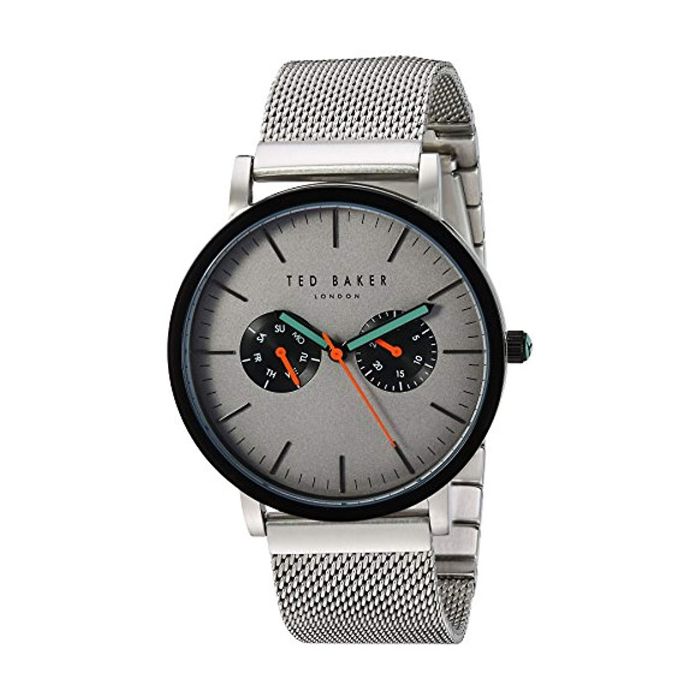 Ted Baker London prezentuje kolekcję modnych zegarków - Brit. Model Brit 10031187 to zegarek, który sprawdzi się w przypadku stroju w stylu smart casual zarówno w biurze jak i poza nim. Koperta o średnicy 40 mm oraz pleciona bransoleta zostały wykonane z wysokiej jakości stali szlachetnej, która nie ulega korozji. Bransoleta została zakończona wygodnym zapięciem na przyciski. Czarny pierścień oraz dodatkowe czarne elementy ze stali są wysoce odporne na ścieranie. Grafitowy cyferblat z czarnymi i pomarańczowymi elementami zwraca na siebie uwagę i podkreśla potrzebę indywidualności. Zegarek wyposażono w dokładny mechanizm kwarcowy zasilany baterią. Datownik wskazuje dzień tygodnia oraz dzień miesiąca. Wodoszczelność klasy 30m pozwala na niewielki kontakt z wodą np. zachlapanie.