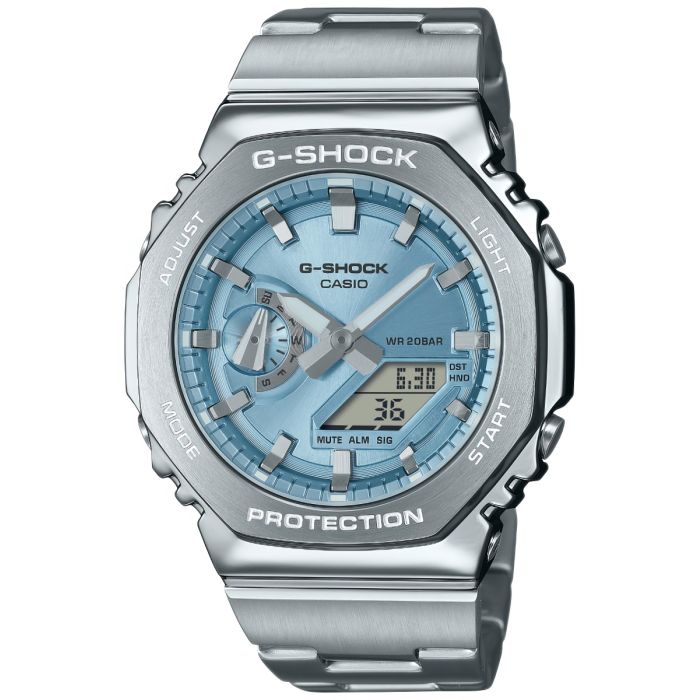 Koperta zegarka wykonana jest z wysokiej jakości stali szlachetnej, która została precyzyjnie wykończona poprzez procesy kucia, cięcia i polerowania, nadając jej stylowy, ośmiokątny kształt. Stalowa bransoleta dodaje zegarkowi elegancji i jest pierwszym tego typu rozwiązaniem w linii GM-2100, co sprawia, że zegarek świetnie sprawdza się zarówno w codziennych sytuacjach, jak i na spotkaniach biznesowych. Wzmocniona żywicą obudowa zapewnia dodatkową wytrzymałość, charakterystyczną dla serii G-Shock.