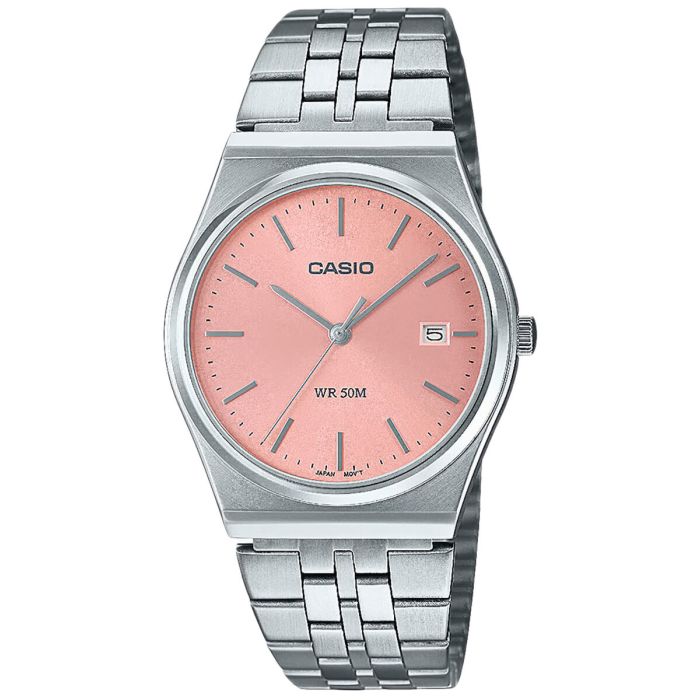 Zegarek Casio MTP-B145D-4AVEF to stylowy czasomierz. Wykonana ze stali szlachetnej srebrna koperta nadaje mu nowoczesnego wyglądu, doskonale harmonizującego z różową tarczą tego zegarka na bransolecie. Szlif promienisty tarczy sprawia, że będzie się pięknie mienić pod wpływem światła. Szkło mineralne pokrywające tarczę zegarka Casio cechuje się wysoką odpornością na stłuczenia. Srebrna bransoleta dodaje elegancji oraz cechuje się wysoką odpornością na korozję.