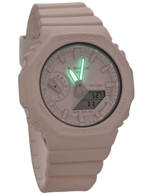 Różowa koperta zegarka została wykonana z żywicy wzmocnionej włóknem węglowym (carbon) oraz jest niezwykle cienka (11 mm). Dzięki tym cechom zegarek G-Shock będzie wygodny, lekki w noszeniu oraz trwały. Pasek z tworzywa sztucznego o standardowym zapięciu doskonale dopasuje się do nadgarstka oraz sprawdzi się świetnie podczas uprawiania sportu. Różowa tarcza zegarka G-SHOCK GMA-S2100BA-2A1ER posiada cyfrowo-analogowy odczyt czasu. Będzie czytelna również nocą, ze względu na podświetlenie diodą LED oraz pokryciem wskazówek i indeksów powłoką Neobrite. Tarcza damskiego zegarka G-SHOCK GMA-S2100BA-4AER pokryta jest niezwykle odpornym na stłuczenia szkłem mineralnym. To nie tylko zegarek do uprawiania sportu - design zegarka dopełni każdy outfit. Wiele wariantów kolorystycznych serii GMA-S2100 pozwala Ci wyrazić siebie za sprawą zegarka G-SHOCK.