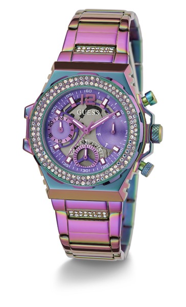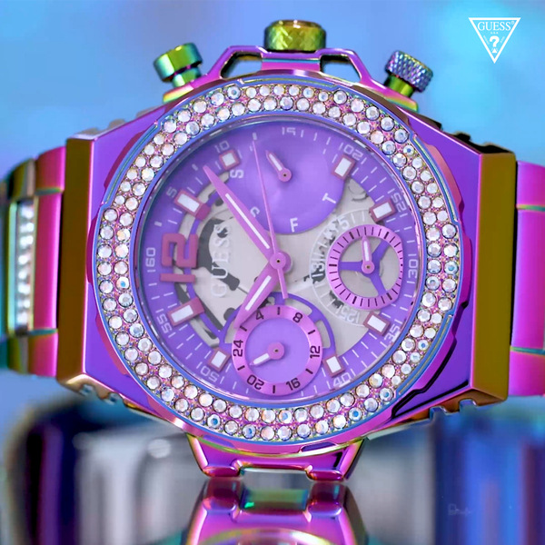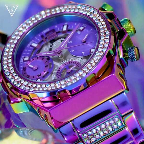 Całość zegarka Guess zaprezentowano na stalowej bransolecie, również mieniącej się wieloma kolorami. Zastosowane tu zapięcie motylkowe ułatwia zakładanie i zdejmowanie czasomierza z ręki.