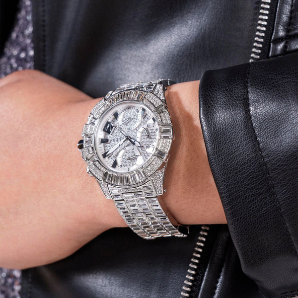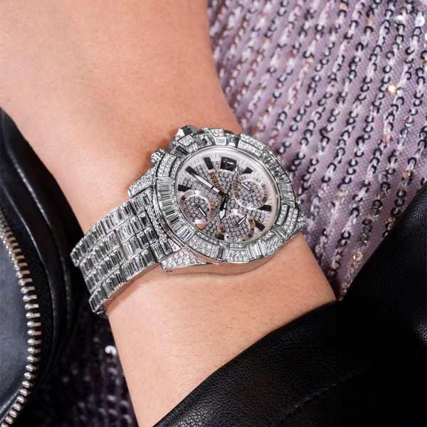 Koperta zegarka wykonana została z wysokiej jakości stali szlachetnej i jest zdobiona cyrkoniami, co dodaje zegarkowi wyjątkowego blasku. Okrągła koperta o szerokości 39 mm i grubości 11 mm jest doskonale zbalansowana, a jej srebrny kolor nadaje elegancki i ponadczasowy wygląd. Zegarek wyposażony jest w srebrną bransoletę ze stali szlachetnej, która jest nie tylko trwała, ale także ozdobiona cyrkoniami, co podkreśla luksusowy charakter modelu. Zapięcie zatrzaskowe z zabezpieczeniem gwarantuje wygodę i bezpieczeństwo użytkowania.