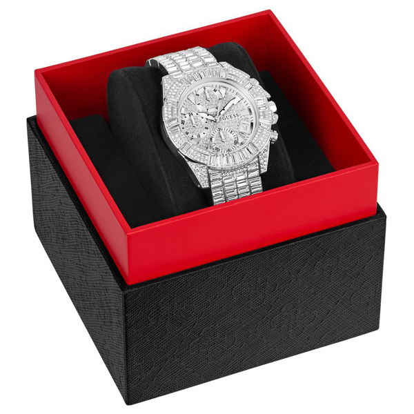Tarcza zegarka Guess GW0812L1 utrzymana jest w srebrnym odcieniu, idealnie dopasowanym do reszty modelu. Ozdobiona cyrkoniami, nadaje zegarkowi biżuteryjny i luksusowy charakter, a tradycyjne wskazówki umożliwiają precyzyjne odczytanie godziny. Zegarek posiada także powłokę luminescencyjną, co ułatwia korzystanie z niego w ciemności. Tarcza chroniona jest przez mineralne szkło, które zapewnia doskonałą odporność na stłuczenia oraz wysoką przejrzystość, co pozwala cieszyć się jego elegancją przez długi czas.