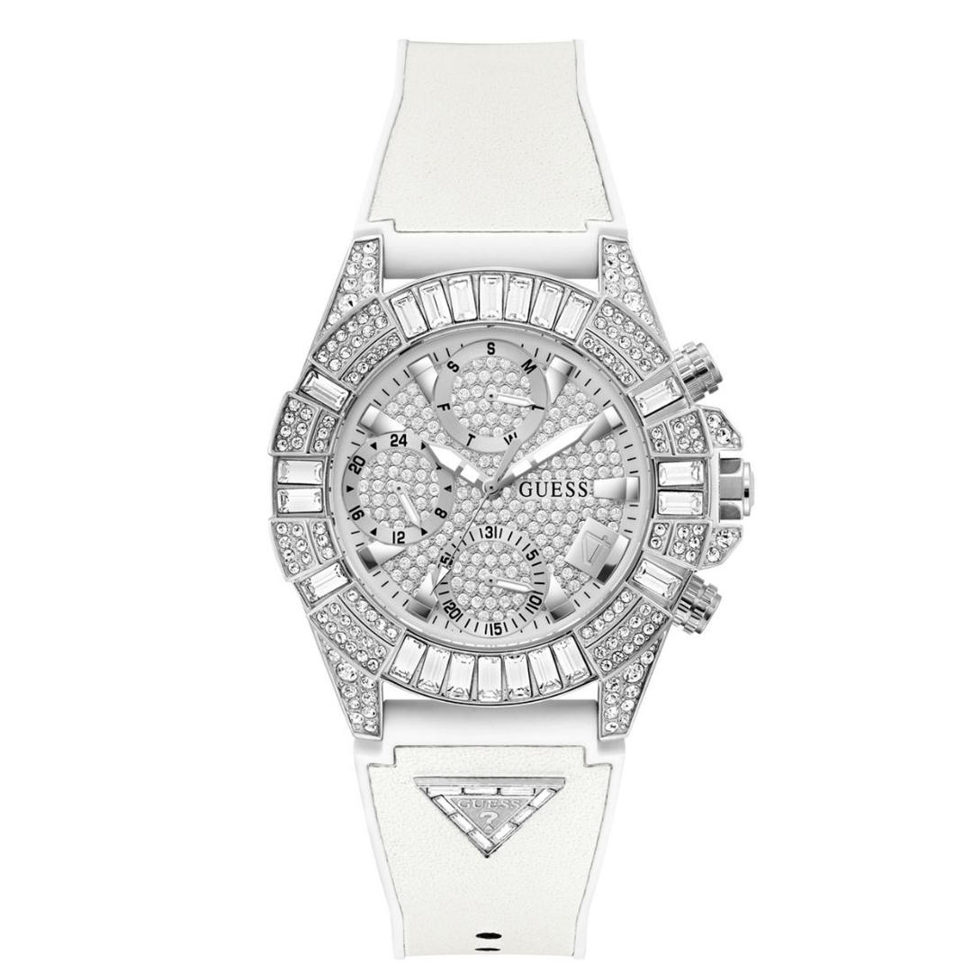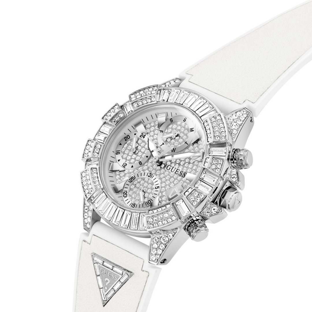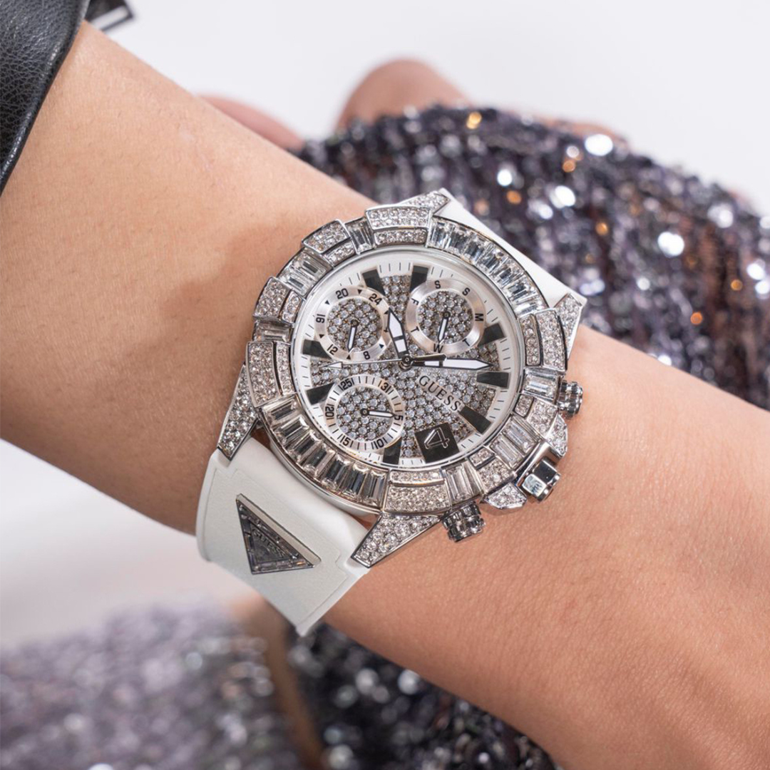 Z okazji 40. rocznicy GUESS, przedstawiamy zegarek, który jest synonimem luksusu i ponadczasowego stylu. Zegarek GW0814L2 to prawdziwa perła w jubileuszowej kolekcji, która łączy w sobie elegancję i ekstrawagancję w jednym niezwykłym projekcie. Srebrna koperta w połączeniu z elegancką, srebrną tarczą i białym gumowym paskiem tworzy oszałamiający efekt, który z pewnością przyciągnie spojrzenia. Dodatek w postaci silikonowego paska FLEX z wysadzaną srebrnymi kamieniami trójkątną tabliczką „GUESS” dodaje nowoczesnego sznytu i klasy.