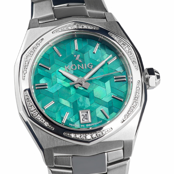 Tarcza zegarka może pochwalić się wyjątkową, morsko - zieloną barwą masy perłowej, mieniącej się różnymi kolorami za sprawą struktury mozaiki. Zastosowanie prostych, podłużnych indeksów i delikatnych wskazówek zapewnia urządzeniu kompletną przejrzystość. Na godzinie 6 widnieje datownik wskazujący bieżący dzień miesiąca. Tarczę chroni odporne na zarysowania szkiełko szafirowe.