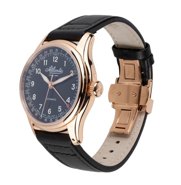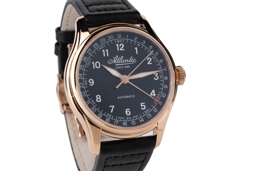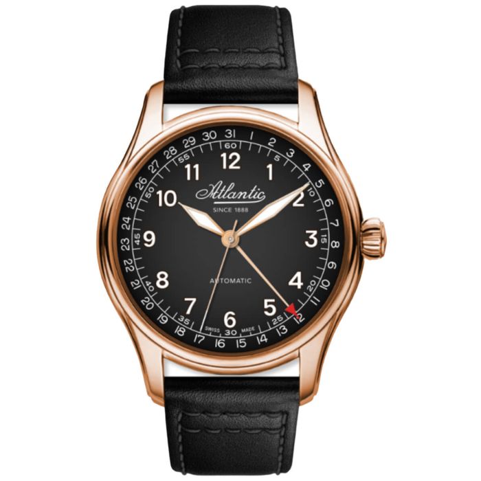 Powierzchnia cyferblatu wytworu marki Atlantic uderza w ciemne tony, eksponując swój klasyczny design poprzez zestaw jasnych indeksów pod postacią cyfr arabskich. Za nimi podążają smukłe, acz wyraźne wskazówki o tej samej barwie. Obydwa elementy pokryto warstwą powłoki luminescencyjnej, czyniącej odczyt godziny równie łatwym w świetle dnia, jak i podczas nocnych ciemności. Krawędzią cyferblatu biegnie podziałka minutowa, pod którą swe miejsce ma licznik dni miesiąca. Jego obecny stan wskazuje najcieńsza, oznakowana czerwoną końcówką, wskazówka. Osłonę cyferblatu zapewnia w danym modelu szkiełko szafirowe, o wyjątkowej odporności i twardości.