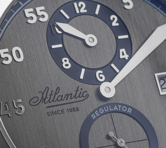 Największym wyróżnikiem zegarka Atlantic Regulator Automatic 53781.41.43 jest jego wyjątkowa, szara tarcza. Dzięki zastosowaniu funkcji regulatora, osiągnięto tu wyżyny przejrzystości za sprawą zapewnienia każdej wskazówce indywidualnej tarczy. Po powierzchni cyferblatu krąży pokaźna wskazówka minutowa, ponad osią ujrzymy subtarcze godzinową, natomiast poniżej widnieje totalizator sekundnika. Po prawej stronie tarczy głównej ma swoje miejsce datownik, wskazujący bieżący dzień miesiąca. Nie idzie się także doszukać żadnych oszczędności w jakości chroniącego tarczę szkiełka. Zastosowano tu szkło szafirowe, o wyjątkowej wytrzymałości naturalnie ustępującej jedynie wyrobom diamentowym.