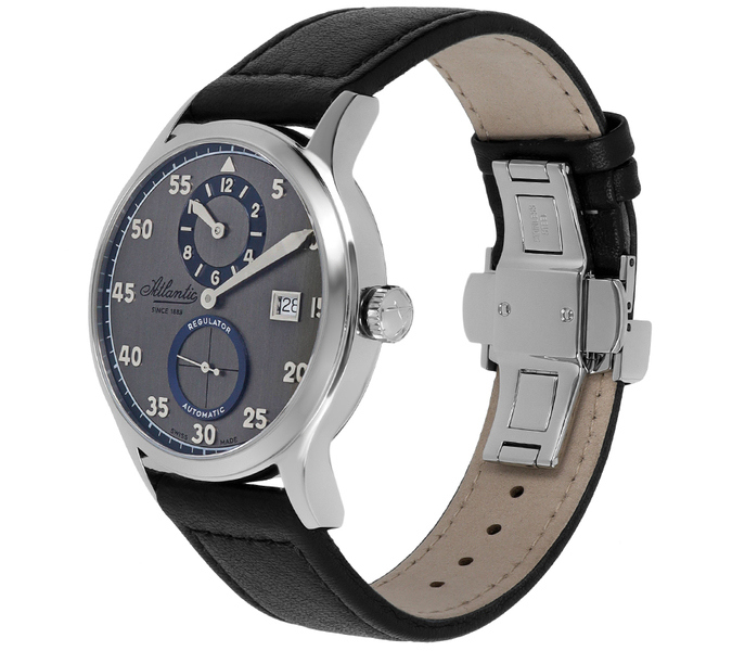 Zegarek Atlantic Regulator Automatic 53781.41.43 prezentuje się niezwykle gustownie na czarnym, eleganckim pasku z lekkiej, wysokiej jakości skóry naturalnej. Przed ześlizgnięciem czasomierza z nadgarstka chroni zapięcie motylkowe.