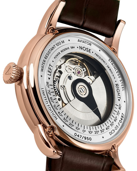 Wodoszczelność zegarka została określona na 10 bar. Wartość ta pozwoli Ci na pływanie bez zdejmowania czasomierza z ręki. U boku obudowy widnieje masywna, ściśle profilowana koronka zdobiona logotypem marki Aviator. Jej kształty nawiązują do wyposażenia pilotów, gdzie koronka musiała być na tyle duża by można było ją chwycić w grubych rękawicach lotniczych. Spód koperty wieńczy transparentny dekiel, przez który możesz obserwować mechanizm zegarka w akcji. Na jego krawędziach rozpisano specyfikację techniczną modelu, razem z istotnym w przypadku serii limitowanej numerem seryjnym.