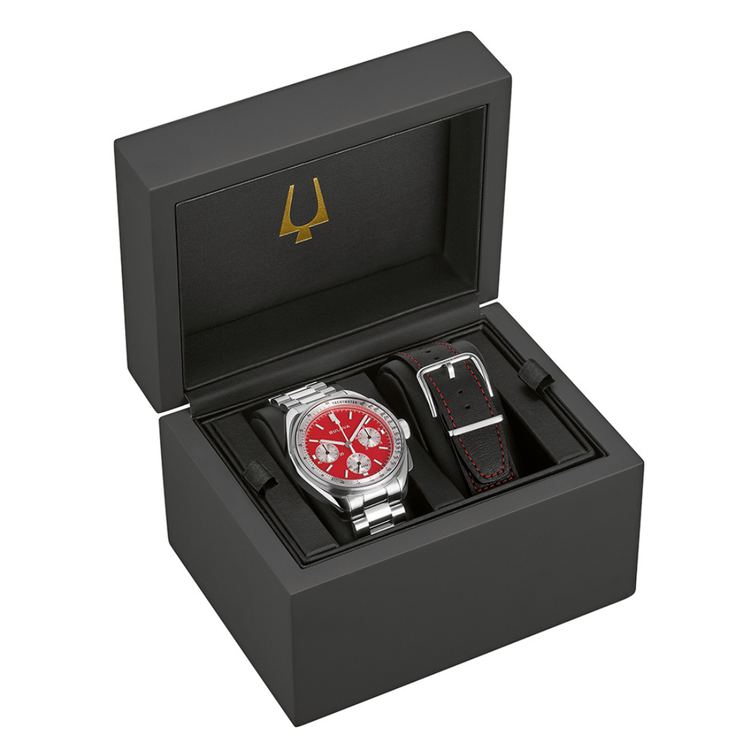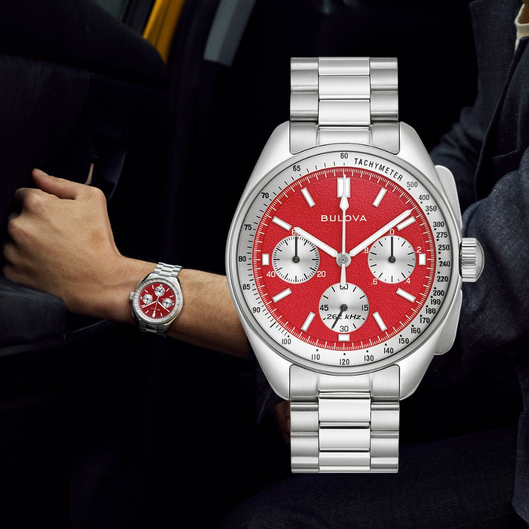 Zegarek BULOVA Lunar Pilot 96K115 należy do kolekcji inspirowanych księżycem chronografów tej marki i wyróżnia się unikalnym designem tarczy typu „panda”. Posiada intensywnie czerwoną tarczę inspirowaną kolorem „krwawego księżyca”, na której umieszczono trzy kontrastujące srebrne sub-tarcze. Zastosowane srebrne indeksy i smukłe wskazówki pokryte warstwą luminescencyjną zapewniają doskonałą widoczność nawet przy słabym oświetleniu. Na krawędzi tarczy znajduje się srebrny pierścień tachymetru, który stanowi dodatkowy, stylowy akcent.