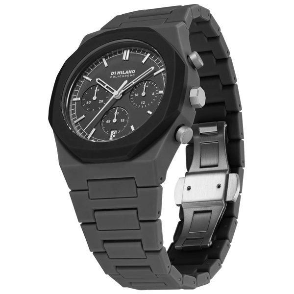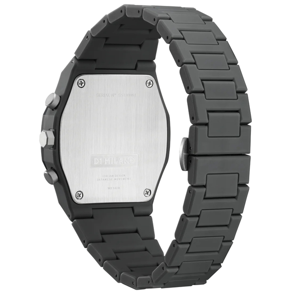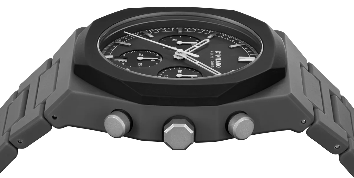 Zegarek ma wyjątkową kopertę wykonaną z poliwęglanu pokrytego miękkim materiałem. To nadaje mu nie tylko trwałość, ale także wyjątkowo przyjemny w dotyku charakter. Dyskretne zapięcie motylkowe dodaje elegancji i minimalizmu całej konstrukcji. Bezel z czarnego poliwęglanu dodaje zegarkowi wyrazistego wyglądu. Tył koperty zegarka wykonany jest ze stali nierdzewnej, co gwarantuje trwałość. Całkowicie matowa ciemnoszara bransoleta i koperta z dodatkiem czerni na bezelu to kombinacja która uzupełni każdy Twój strój.