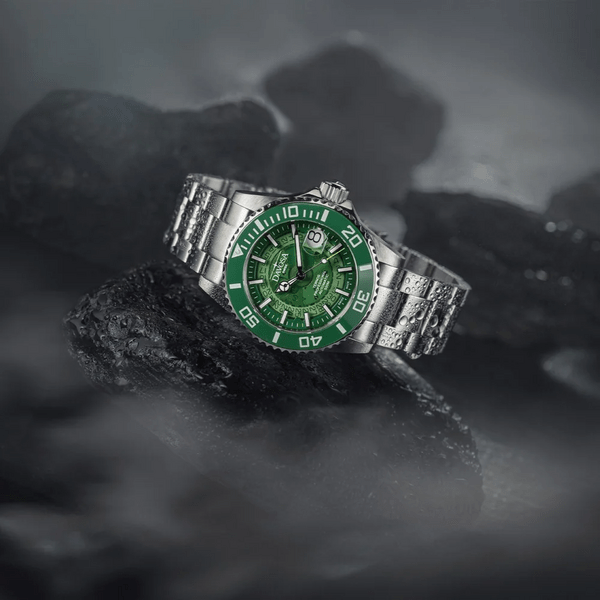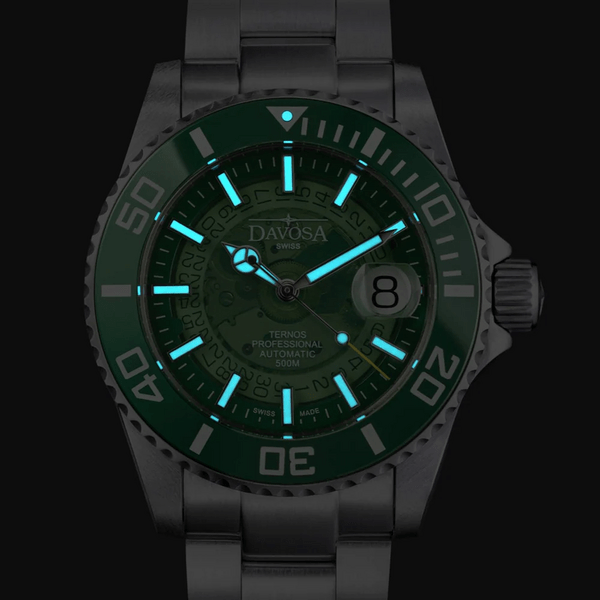 Tarcza zegarka DAVOSA Ternos Professional 161.535.70 ma głęboki kolor zieleni, który harmonijnie współgra z ceramicznym bezelem tej samej barwy. Na tarczy znajdują się białe indeksy i wskazówki pokryte luminescencyjną warstwą SuperLumiNova® BGW9, która zapewnia doskonałą czytelność w każdych warunkach oświetleniowych. Tarcza posiada również datownik z lupą typu Cyclops umieszczony przy godzinie 3. Szkło zegarka jest wykonane z odpornego na zarysowania szafirowego kryształu z powłoką antyrefleksyjną.