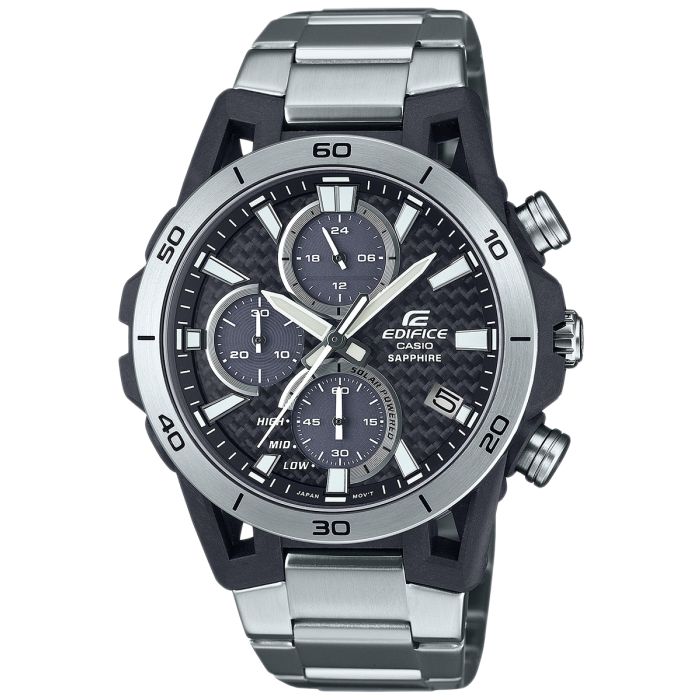 Zegarek EDIFICE EFS-S640D-1AVUEF posiada elegancką czarną tarczę, która świetnie komponuje się z luminescencyjnymi oznaczeniami Neobrite, umożliwiając odczyt czasu nawet w ciemności. Na tarczy znajduje się chronograf (stoper) oraz datownik, który wskazuje dzień miesiąca. Funkcja chronografu pozwala na dokładny pomiar czasu do 30 minut, co czyni go idealnym narzędziem do sportowych aktywności. Tarcza chroniona jest przez szafirowe szkło z powłoką antyrefleksyjną, które zapewnia doskonałą czytelność i odporność na zarysowania, dzięki 9. stopniowi twardości w skali Mohsa.