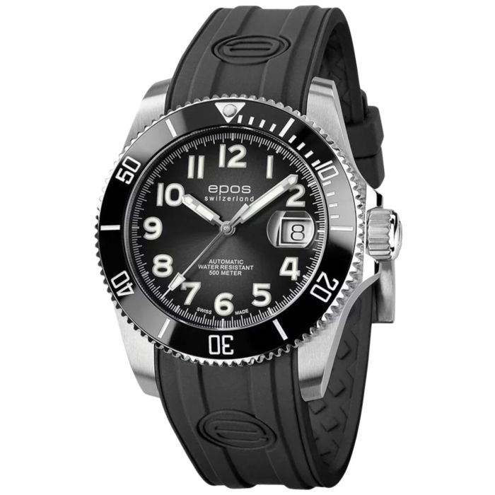 Czarny cyferblat zegarka Epos Titanium 3504.131.80.35.55 z efektem szlifu słonecznego nie tylko przyciąga wzrok, ale również zapewnia doskonałą czytelność. Wyposażony w datownik dni miesiąca z lupą, oferuje dodatkową funkcjonalność, która jest niezwykle praktyczna na co dzień. Szafirowe szkiełko z antyrefleksem chroni tarczę przed zarysowaniami i zapewnia klarowność odczytu w każdych warunkach oświetleniowych. Jednokierunkowy, obrotowy bezel z czarnej ceramiki dodaje nowoczesnego charakteru i jest idealnym narzędziem dla nurków.