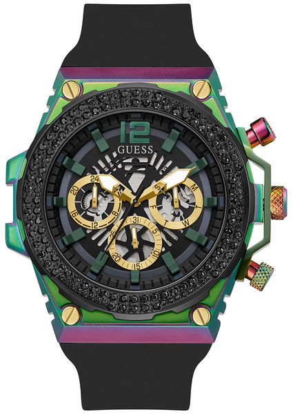 Wielokolorowa stalowa koperta o niestandardowym kształcie nadaje zegarkowi Guess unikalny wygląd, który doskonale oddaje modowe trendy. Wodoszczelność na poziomie 5 ATM zabezpiecza zegarek przed zachlapaniem, choć nie jest zalecane zanurzanie go w wodzie. Elastyczny pasek z tworzywa sztucznego zapewnia komfort noszenia i jest odporny na kontakt z wodą.