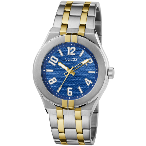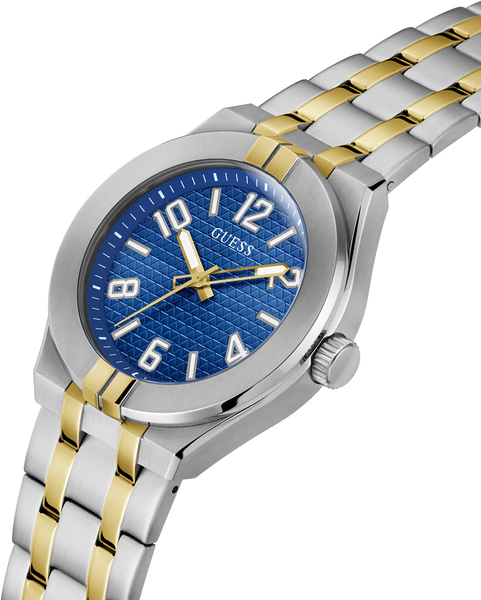 Tarcza zegarka Guess GW0661G1 ma piękny, głęboki niebieski kolor, który dodaje mu wyjątkowego charakteru. Wskazania czasu są analogowe, co podkreśla klasyczny wygląd zegarka. Szkło mineralne, które chroni tarczę, charakteryzuje się wysoką odpornością na zarysowania i stłuczenia. Dzięki swojej elastyczności, mineralne szkiełko zapewnia doskonałą przejrzystość i długotrwałą ochronę.