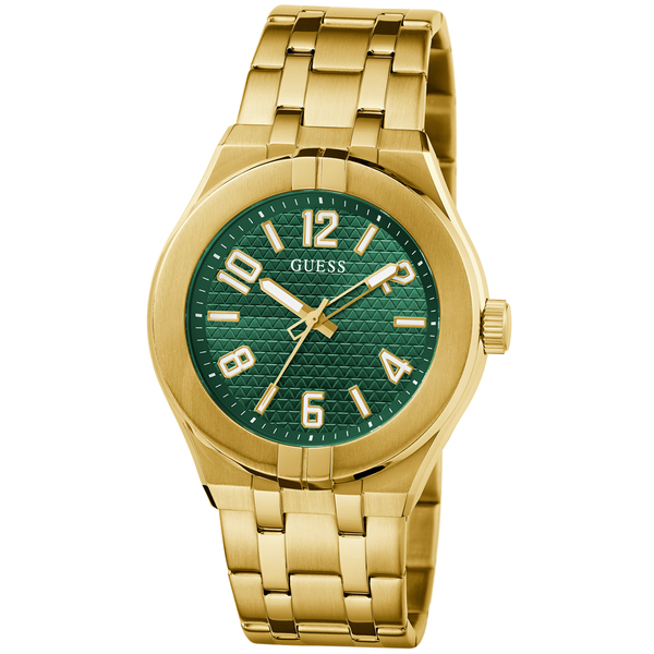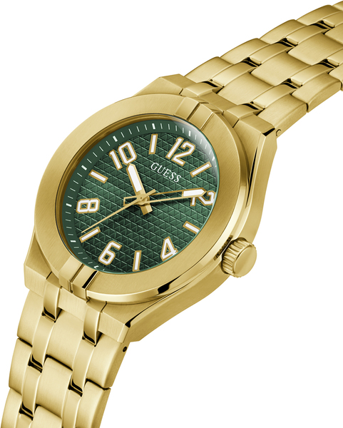 Tarcza zegarka Guess GW0661G2 przyciąga wzrok swoim wyjątkowym zielonym kolorem. Klasyczne wskazówki poruszają się nad tarczą, zapewniając czytelność i elegancję. Szkiełko mineralne chroni tarczę przed uszkodzeniami i zadrapaniami. Dzięki swojej wytrzymałości i elastyczności, jest odporne na pęknięcia i łatwo się poleruje, co zapewnia długotrwałą estetykę zegarka.