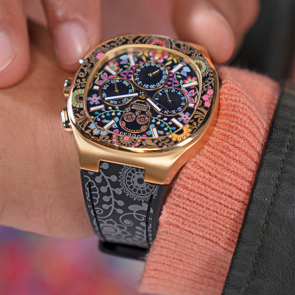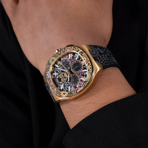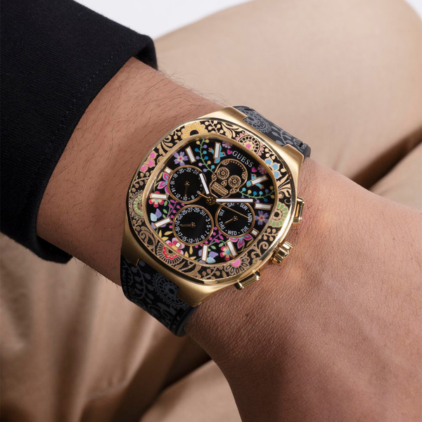 Zegarek GUESS Catrin GW0784G1 posiada kopertę wykonaną z stali szlachetnej w eleganckim złotym kolorze, co dodaje mu luksusowego wyglądu. Koperta o szerokości 44 mm jest doskonale dopasowana do męskiego nadgarstka, tworząc harmonijną całość z resztą designu. Dopełnieniem całości jest czarny pasek, który nie tylko świetnie kontrastuje z złotą kopertą, ale także zapewnia wygodę noszenia przez cały dzień. Pasek wykonany z trwałego materiału gwarantuje komfort i odporność na codzienne uszkodzenia.