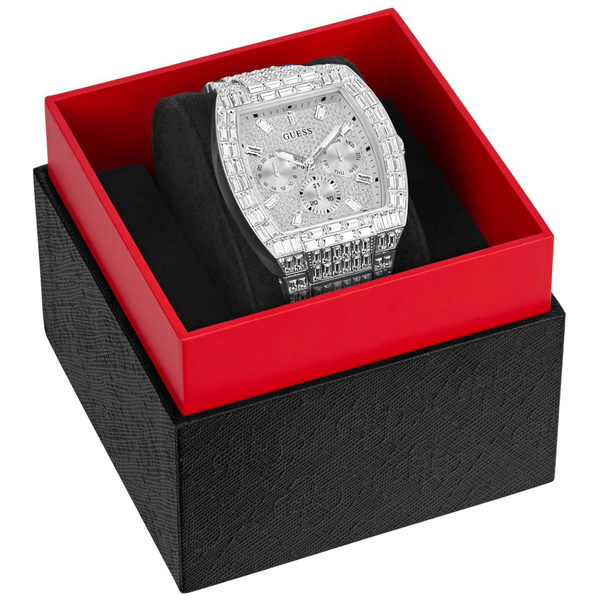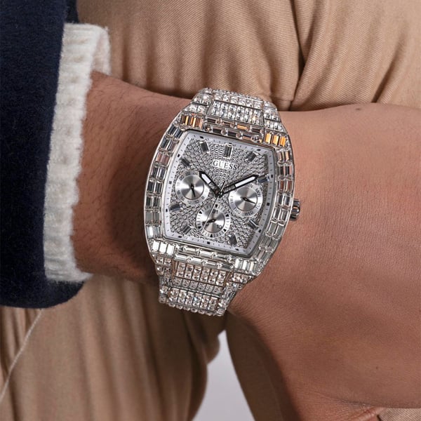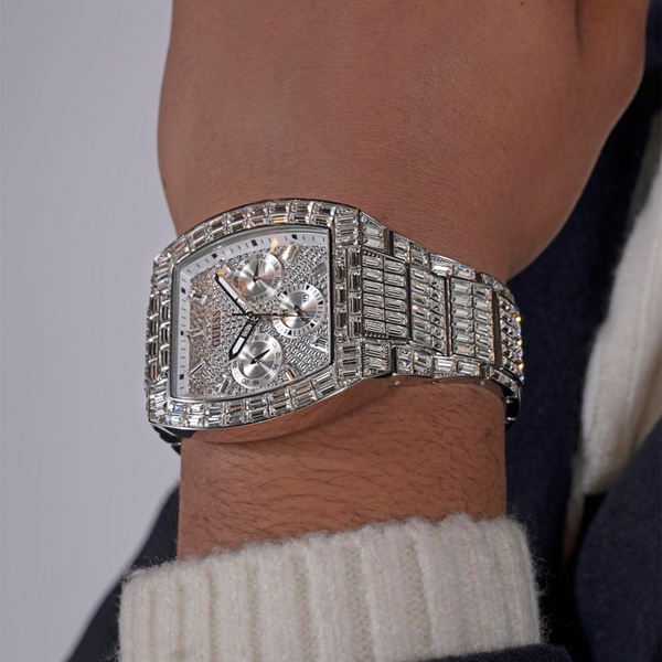 Srebrna tarcza zegarka GUESS Phoenix GW0816G1 zdobiona cyrkoniami nadaje mu luksusowego, biżuteryjnego charakteru, idealnego na każdą okazję. Czas odczytywany jest w klasyczny, analogowy sposób za pomocą wskazówek. Zegarek wyposażony jest także w funkcję wyświetlania czasu dobowego w systemie 12/24h, co pozwala dostosować zegarek do preferencji użytkownika. Dodatkowo, na tarczy znajduje się datownik, który pokazuje zarówno dzień miesiąca, jak i nazwę dnia tygodnia. Całość chroni szkło mineralne, odporne na uderzenia i stłuczenia, zapewniające długotrwałą ochronę tarczy.