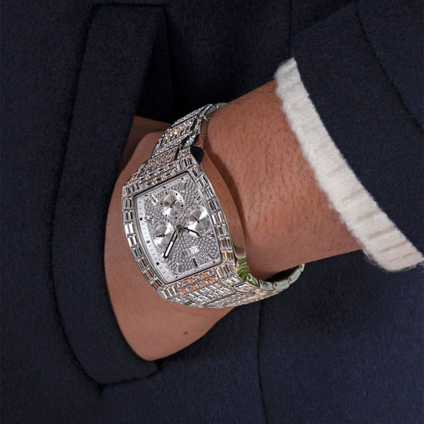 Koperta zegarka ma niestandardowy, przyciągający wzrok kształt i szerokość 43 mm, co nadaje mu nowoczesnego i wyrazistego charakteru. Wykonana jest z wysokiej jakości stali szlachetnej oraz ozdobiona cyrkoniami, które dodają elegancji i blasku. Dzięki wodoszczelności na poziomie 50 m (5 ATM) zegarek sprawdzi się w codziennym użytkowaniu, również w kontakcie z wodą. Bransoleta wykonana ze stali szlachetnej, również zdobiona cyrkoniami, doskonale komponuje się z kopertą, tworząc spójną całość. Zapięcie zatrzaskowe z dodatkowym zabezpieczeniem zapewnia pewność i komfort noszenia, a możliwość regulacji obwodu bransolety pozwala na idealne dopasowanie zegarka do nadgarstka.