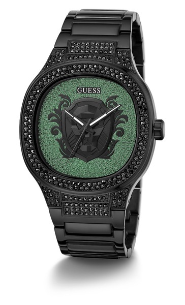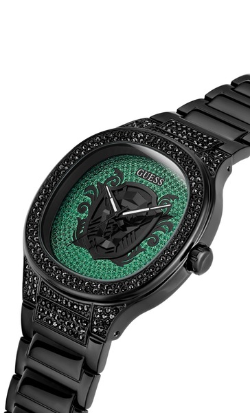 Wyjątkowa stylistyka i design są sztandarowymi zaletami męskiego zegarka Guess Kingdom GW0565G2. Powierzchnia jego tarczy pokryta jest wzorem kryształków układających się w zieloną, gustowną mozaikę. Tworzy to niezwykły efekt głębi tarczy, znad której wznosi się majestatyczny wzór tarczy herbowej. Koperta zegarka zyskała czarną barwę dzięki zastosowaniu powłoki IP.
