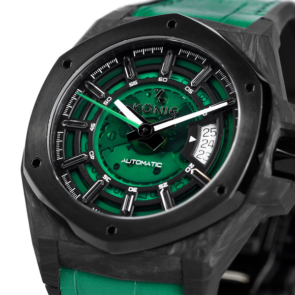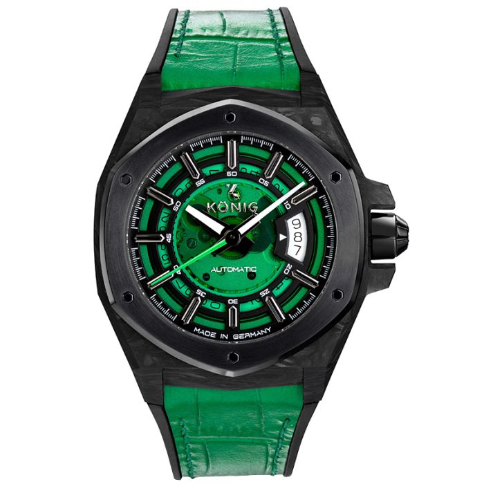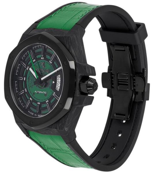 Zegarki Koenig cechuje niemiecka produkcja oraz szwajcarski mechanizm. Marka Koenig to gwarancja autentyczności, niezawodności oraz precyzji. Do stworzenia tych wyjątkowych projektów użyto materiałów o wysokiej jakości takich jak włókno węglowe, szafir, stal szlachetna oraz kamienie szlachetne m.in. takie jak diamenty i szmaragdy.