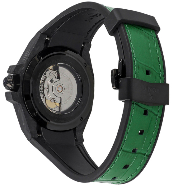 Czarną kopertę wykonano z włókna węglowego, co nadaje zegarkowi wyjątkowej lekkości i trwałości. Całość zaprezentowano na jadowicie zielonym, skórzanym pasku.